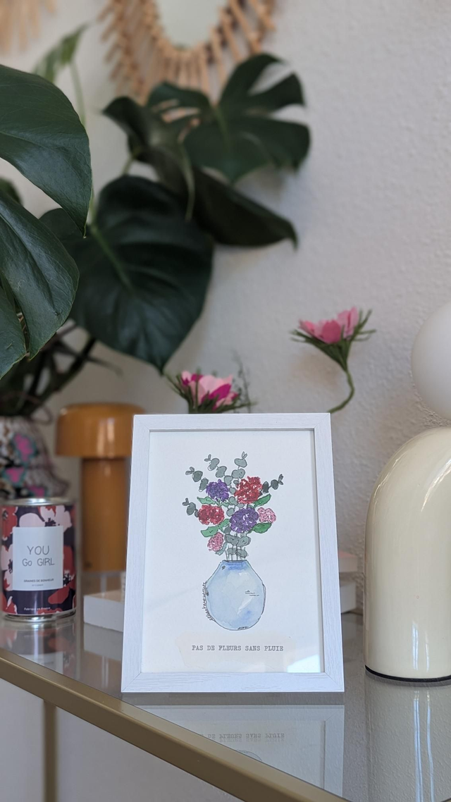 Pluie et fleurs - Aquarelle Originale avec cadre