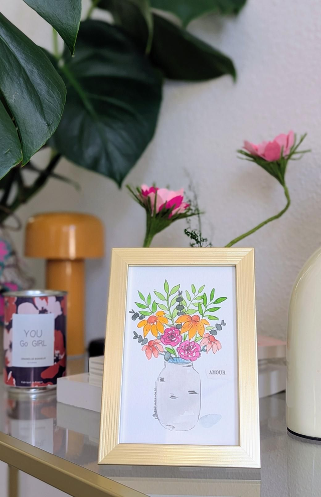 - Avec cadre doré à poser ou à accrocher, dimensions 17 x 12 cm
