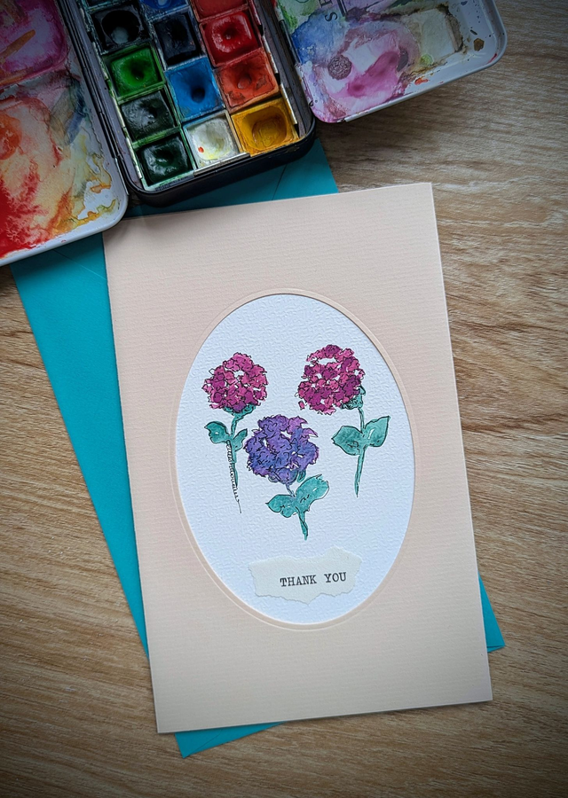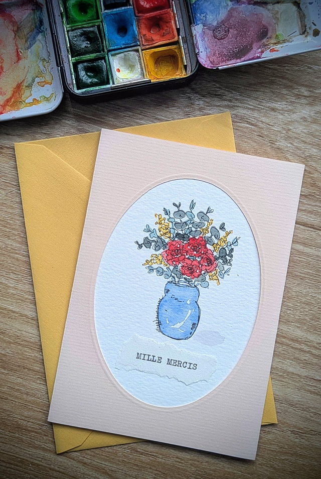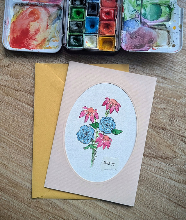 Chaque carte est fabriquée par mes petites mains et peinte à l'aquarelle sur du papier de qualité. Illustration faite-main composée de fleurs et d'un message tapé à la machine à écrire.